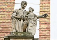 A bal oldali szobor egy ülő, kezében kardot fogó férfialakot mutat be, aki mellett egy címeres pajzsot fogó kisfiú áll.
