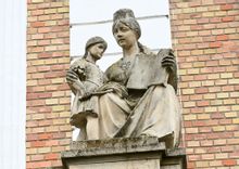 A főépület 1928-ban épült, elkészülésekor több kiemelkedő épületdísz is helyet kapott rajta. Itt kapcsolódik be a történetbe a fentebb bemutatott Krasznai Lajos, az iskola főépületének bejáratát díszítő épületszobrait ugyanis a kiváló szobrászművész készítette. A két szobor immár 98 éve az iskola része, a jobb oldalon egy nőalak látható egy kislánnyal, a nőalak kezében a nyitott könyv az oktatást szimbolizálja, míg a kislány kezében sarló és kéve fedezhető fel.